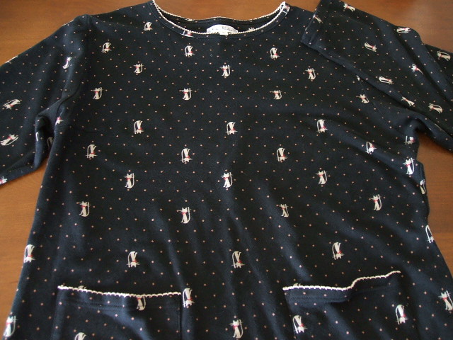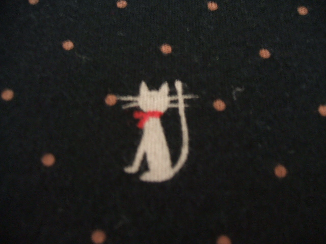 さて、今日の猫ちゃんは娘のパジャマ。薄地の長袖です。去年の9月ごろ、ひと目みて、即購入しました。