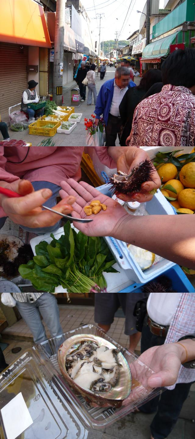鯨の刺身や鯵の味醂干しイカ焼き、明太なんかを試食しながらビール片手に朝市を闊歩(写真右上)しているとウニ発見!これを早速裁いてもらい皆で食べますた(写真右中)新鮮で甘くておいひぃ~♪(^p^)