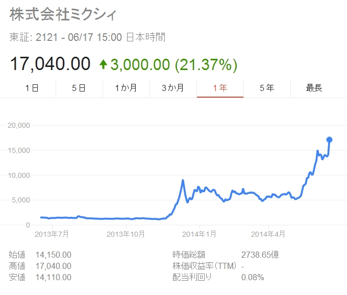 そしてなんと今日のミクシィ(2121)株は値幅制限の上限である3,000円高を記録しストップ高と・・・(つд∩)ウエーン 去年最高に高値で掴んで30万円以上損したゆきママの立場は・・・今持ってれば100万近くプラスだったのにね・・・( ;∀;) イイハナシダナー
