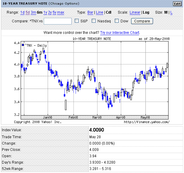 米株価指数は続伸。耐久財受注を好感、らしいですが、結局上がっているのは、エネルギーと素材。エネルギーは、原油価格の反発で上昇。素材は、モンサントとデュポンが、米農務省の将来の気候変動に関するレポートを材料視して上昇(遺伝子組み換え種子)。10年債利回りは、4%を超えました。住宅ローン金利も、せっかく低くなっていたのに、また上がってきています。住宅市場の回復が遅れるでしょう。(Yahoo!Financeのトップページの右下に、平均のローン金利が載っています)