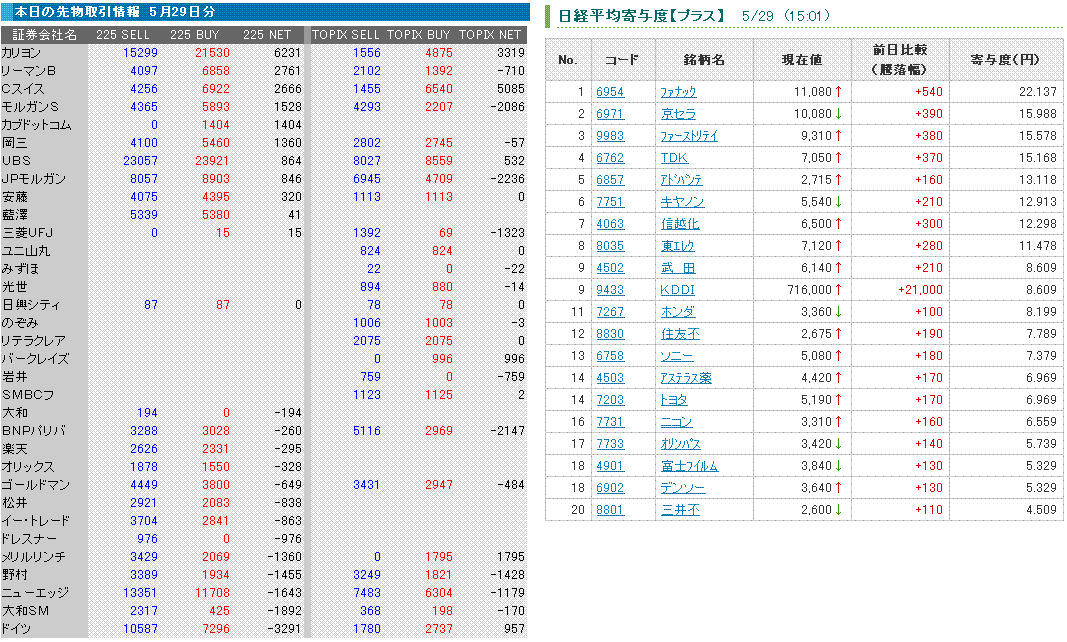 株価指数先物に買い戻しが入って、日経平均、TOPIXは大幅反発。日経平均は、CMEで+200円、先物買い戻しで+200円って感じでした。しかしまあ、クレディスイス、カリヨン(を通じて注文を出しているところ)は何がやりたいんだか・・・。日経平均寄与度上位も、いつもの値嵩株がずらりと並んでいて、かなり裁定買いが入った感じです。裁定買いの影響が大きい値嵩株以外は、どうも上値が重い感じでした。