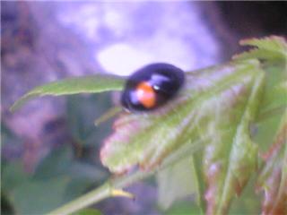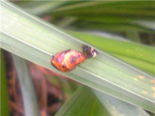 てんとう虫とそのさなぎです。花は赤いみのなる木です。