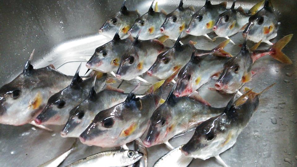 「ギマ」の特徴は背ビレに1本、腹ビレに1対(2本)のトゲがあり、写真のように立たせることができます。
