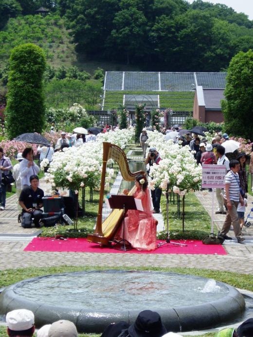 園内では、バラに係わる曲をハープ演奏されており多くの観衆を集めていました。