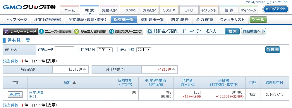 保有株状況@GMOクリック証券:含み損益+192,000円