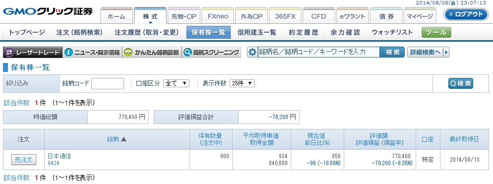保有株状況@GMOクリック証券:含み損益-70,200円