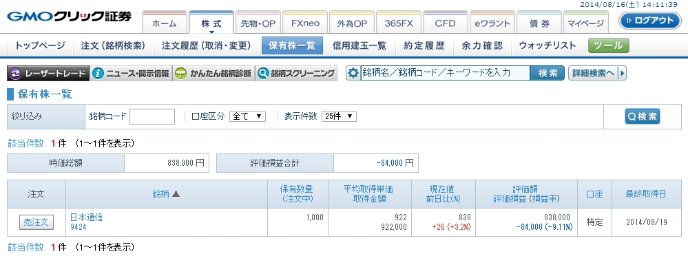 保有株状況@GMOクリック証券:含み損益-83,000円