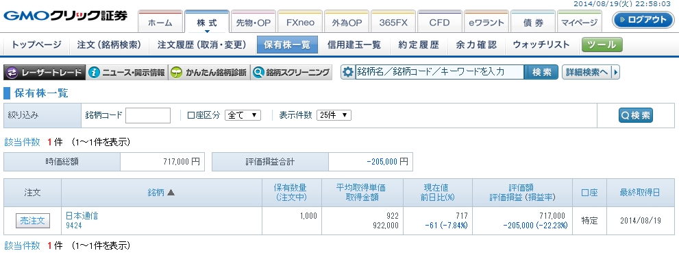 保有株状況@GMOクリック証券:含み損益-205,000円