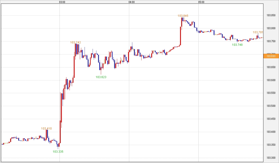 そしてここからは20日(水)のドル・円相場について振り返っていきます。東京市場は、1ドル=102.90~103.20円台で堅調推移となりました。午前中は103円台を前にしてモミ合いが続いていましたが、午後に入ると103.00円ラインをブレイクする仕掛け的なドル買いも入ったのか103円台に突入し、ストップロスを巻き込みながら上値を伸ばし続けました。