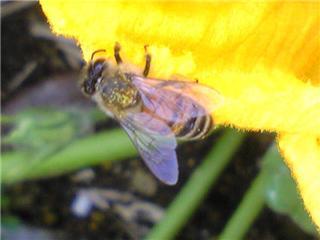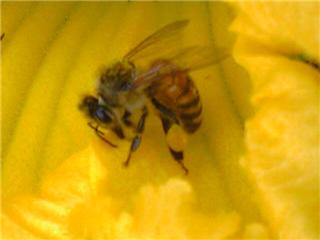 かぼちゃの花にミツバチが来ています。花粉を沢山集めて受粉の助けになります。これで実がなるのです。すばらしいシステムです。お互い利用しあえるなんてすごいですね。
