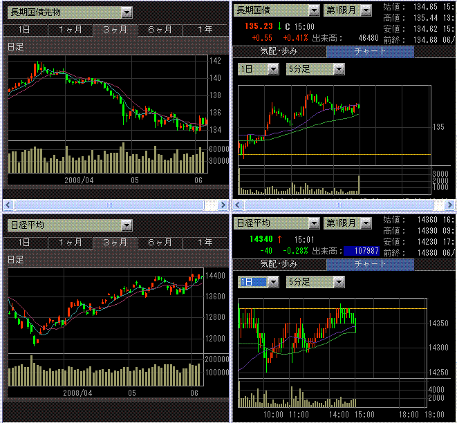 昨日の大幅上昇の反動で下落しましたが、債券先物が大幅上昇していたのを考えると、日経平均は異常なくらいの底堅さでした。値段関係なしの買いが入り続けている感じです。ドル円が円安方向で安定しているのも影響していそうです。業種別では、不動産、メガバンク、商社あたりが弱かったです。不動産は、日興シティによる目標株価引き下げが売られた理由のようです。原油価格下落で、ブリヂストン、横浜ゴムなどが強かったです。
