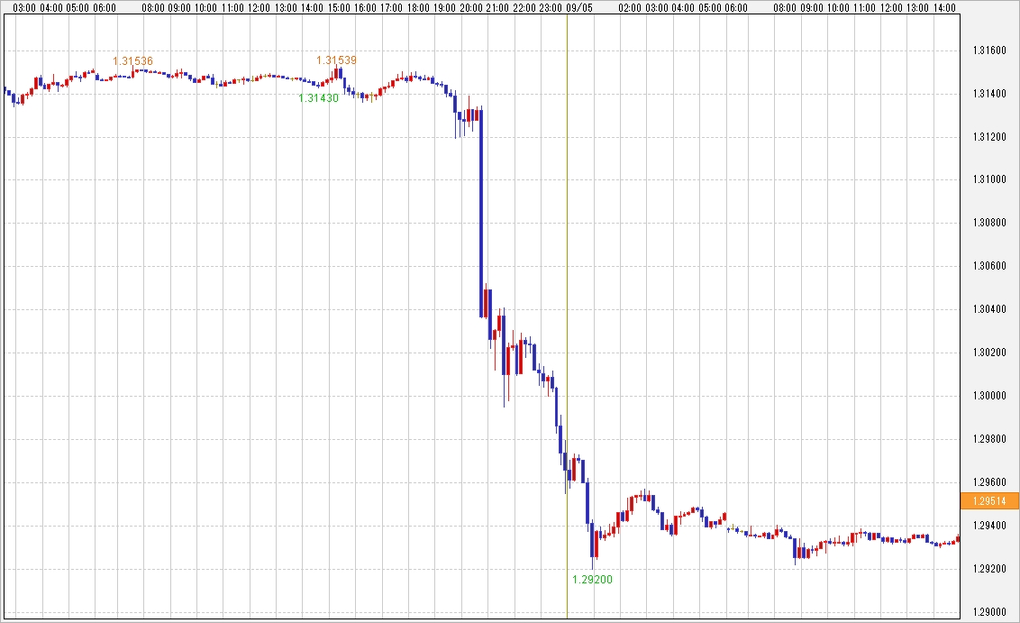 そんなわけで、ユーロがより入手しやすくなって希少性が下がりますから、ユーロ安という状況になります。まずはこの発表で大きく値を下げました。