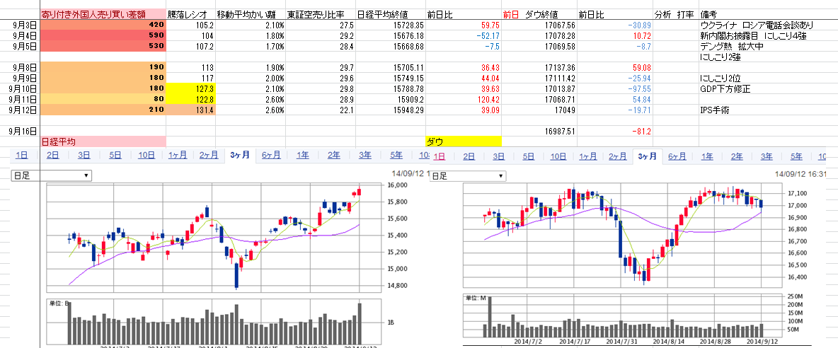 そして日経も16,000付近。ここで普通に考えると、そろそろ下げの連続か、といいたいが、相場は結構強気だ。データで気になったのが、騰落レシオと、日経空売り比率。