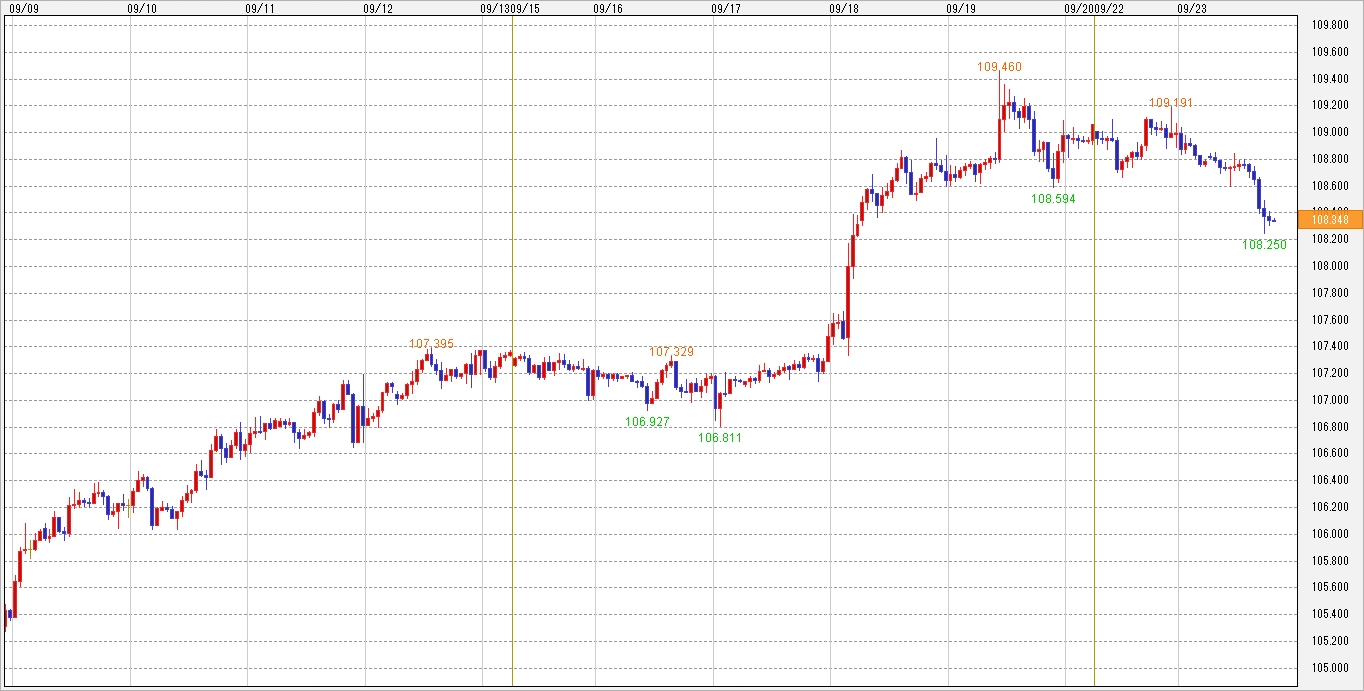 22日(月)の東京市場は、1ドル=108.60~109.10円台での値動きとなりました。序盤は小じっかりとした値動きではじまり、109円台に乗せる場面もありましたが、その後は一旦利益確定の動きに押されて大き目の下落もありました。ただ、買い意欲は旺盛で反発して取引を終えています。