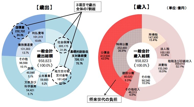 平成26年度一般会計予算を見てみると、歳入が57兆円に対して歳出が96兆円となっており、差し引きで39兆円の赤字になっています↓