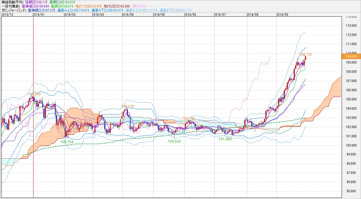 ↑ドル・円の日足チャート。200日移動平均線一目均衡表ボリバン