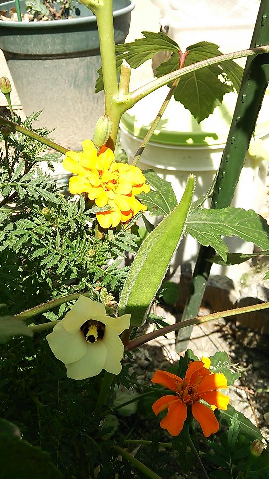 写真はオクラの実が実り、同時に花も咲いている時に撮ったものです。