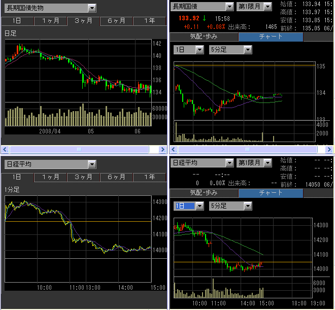 前場は反発して始まりましたが、昼のバスケット注文が売り越しだったことや、GLOBEX米株価指数先物とアジア市場が軟調だったことから後場に崩れました。今日の株式市場は一気に弱くなりました。債券も株も売られていました。商いは閑散で、リスク回避姿勢から様子見ムードが強いようです。