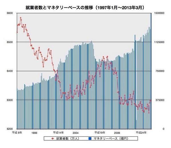 このように生産年齢人口が減っていても、MB増大率を上げる金融緩和拡大(紙幣増刷)で景気を適正水準に上げれば、雇用は増えていくのです。