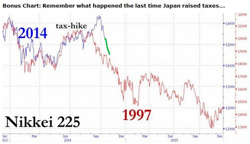 ちなみにここ最近、海外では1997年の消費税引き上げ時の日経平均株価と、現在の値動きを比較するチャートが出回っているようです↓
