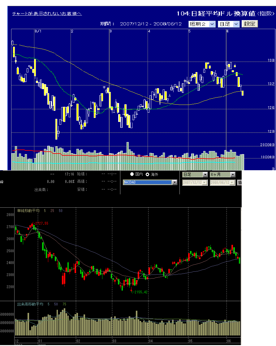 ドル円がだいぶ円安方向に進んでいるため、日経平均はあまり下がらない気がします。もちろん円高になれば下がるでしょうけど。とりあえず、ドル建て日経平均とナスダック指数の連動性が高いので、ナスダックと為替の動き次第な感じです(画像3)。