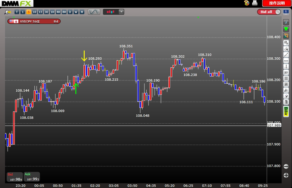 売り買い交錯する108円台を抜けて小じっかり 昨日は久々のトレードとなりました。先週に大ボーナスで+12万というトレードをしてからは手を抜いちゃってましたね(;´∀`) モミ合いが続いていてそれほど美味しそうな相場では無かったこともありますが・・・。