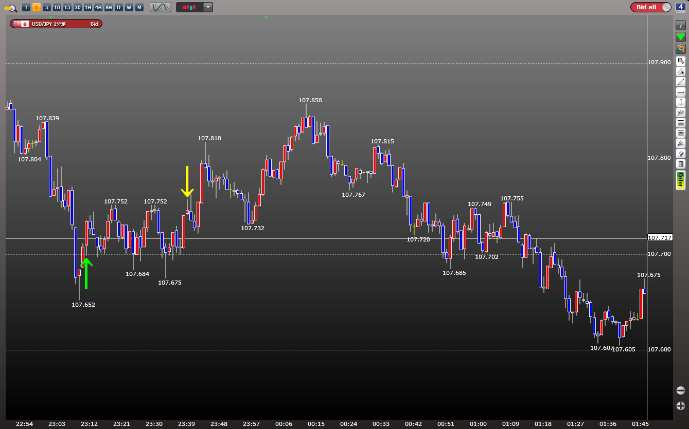 FOMCや週末の日銀イベントといった重要な指標を控えているため、エボラやテロといった極端な要因が無い限りは大きく下げることは無いだろうと考えて、この日の安値水準であった107.70円近辺からロング(買い)で入りました…