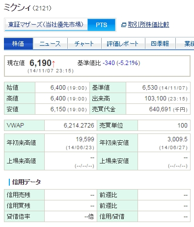 ↑ミクシィの夜間取引ではすでの-300円超という下落幅…\(^o^)/オワタ