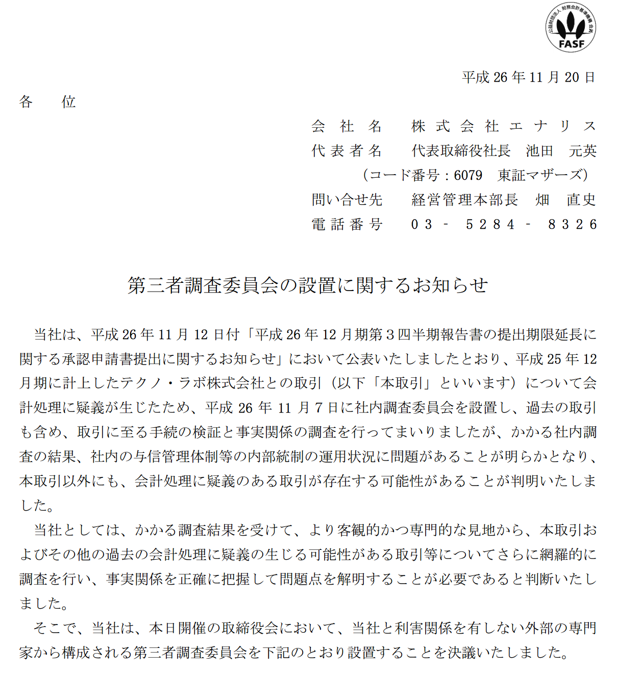 なんと、「結果としてあらぬ疑いをかけられ」ただけで「一点の曇りもなく」かったはずのエナリス(6079)ですが、例のテクノ・ラボ株式会社との取引以外にも会計処理に疑義のある取引が存在する可能性があることが判明したとのことです↓