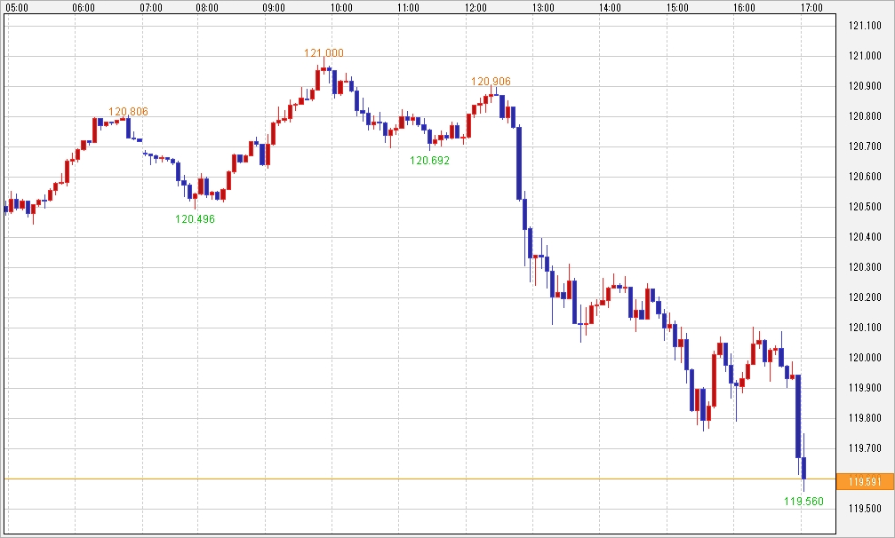 今のところは市場のマインドにそれほど変化はないと思いますが、昨日も書いたように120円台を深く割り込んで先週の支えにもなっていた一目転換線(119.50円付近)を割り込んでくるようだと市場の雰囲気も変わってくるかもしれません。