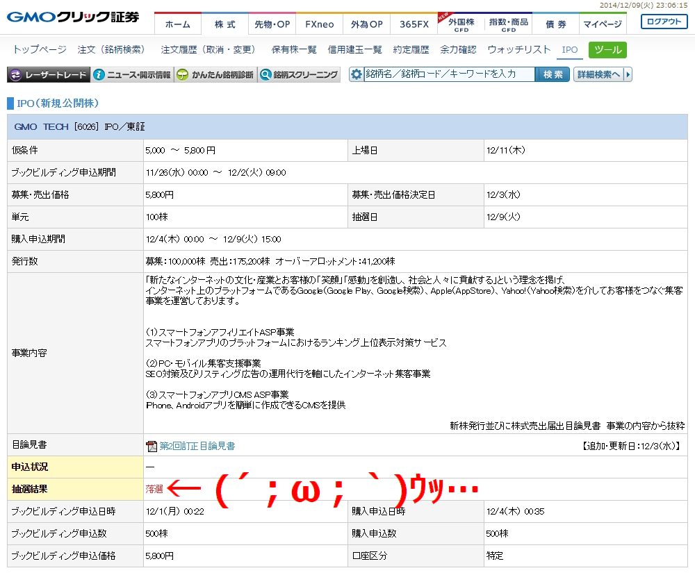 てなわけで、タイトルにもありますように、先日IPO(新規公開株)の募集に応募したGMO TECH(GMOテック 6026)は残念ながら落選となりました↓
