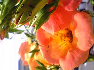 梅雨に入ったしるしがこのノウゼンカヅラの花です。例年この花が咲くと梅雨入り、咲き終ると梅雨の終わりです。湿気と温度に敏感なのでしょう。ほんとに良く当たります。気象台の予報よりこちらのほうが実際に即しています。生ける温湿度計でしょうか?此花には蜜が良く出るのかアリがしきりに来て蜜や花粉を運んでいるのでしょう。もともとは高知にあったものを譲り受け、ここで栽培始めました、周りのお家にも増えてきましたが30年ぐらい前はうちだけでした。原木は枯れましたが子孫が残っています