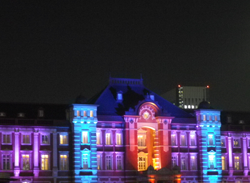 ライトアップされた駅舎です。もっといろいろ撮りたかったけど、警備スタッフの人が「立ち止まらない下さい」とやたらにせかすもんで、マトモに撮れていません(半分は言い訳)。後ろを見ても誰もいないのになあ・・・