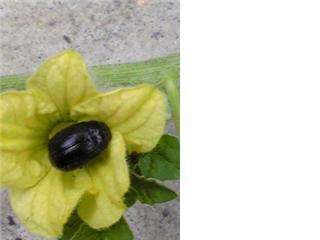 こがねむしもこのへんになるとまったく種類がわかりません。写真に撮るのに丁度いいとスイカの花に乗せました。植木のスイカはもう終わりなのに今頃花で大丈夫かなと思います。8月にしか食べれません。