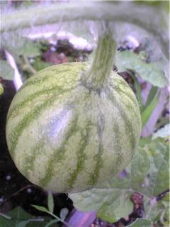 スイカとかぼちゃがなっています。スイカはまだ大きくなる前でこれからです。かぼちゃはもう直ぐ収穫です。だいぶ重くなってきました。これから雨に当たって大きくなるのでしょうね。