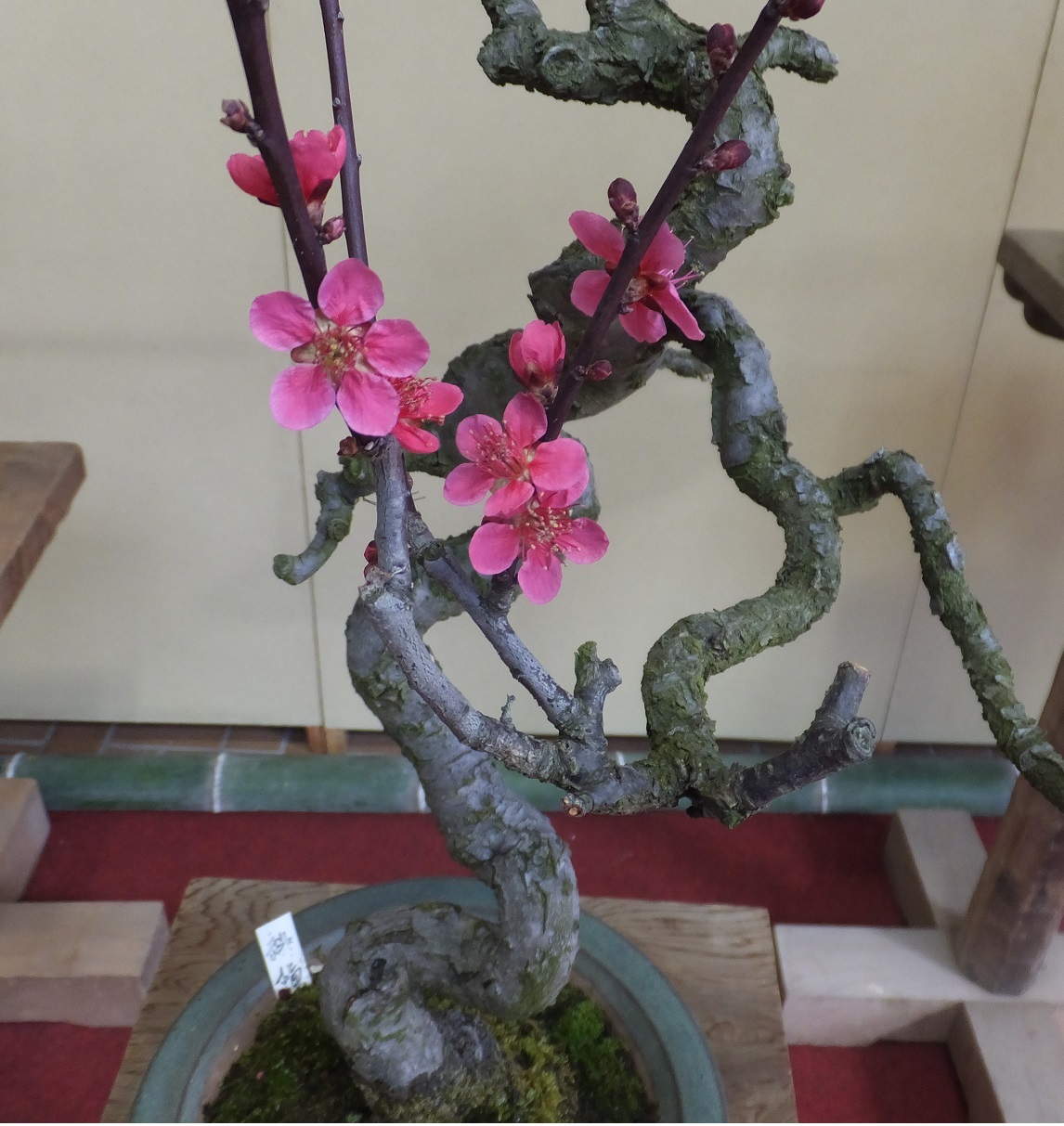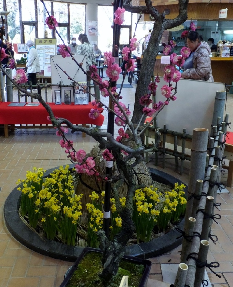 名城公園の梅まつり、展示棟での大規模な盆梅と掘り出した木の飾りと、