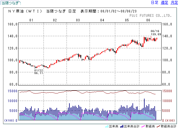 ∇原油価格の高騰について。最近ようやく、年金などの巨額の長期マネーが商品市場に流れ込んでいることが原油価格の押し上げにつながっている、という見方のニュースが増えてきました。昨晩のNHKスペシャルでも、コモディティに投資している年金基金へのインタビューがありました。アメリカでは、年金などのマネーも「投機」と批判する動きもあって、年金基金による商品投資の制限を狙った提案が議会に出されているようです。