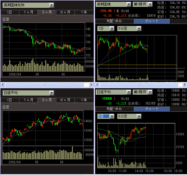 先物中心に前引けにかけて売られるも後場に買いが入り、結局前日比で小幅マイナスで引けました。現物出来高は低水準。原油高により、飛行機、自動車が避けられ鉄道が使われることが多くなるとの見方から、JR株が高かったです。スルガコーポの民事再生法適用の申請で、不動産セクターが新興不動産中心に大きく売られました。メガバンクが大引けにかけて売られたのが、少し嫌な感じ。