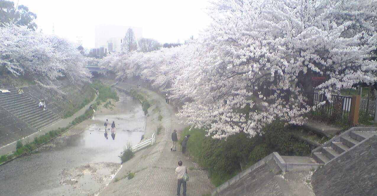 散り始めた山崎川に舞い降りる人々。