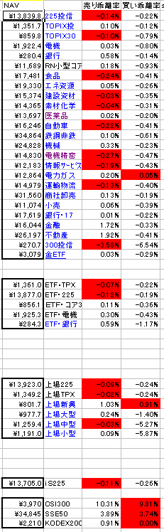 (3)売買が薄いことが問題なのではなく、bid-askスプレッドと板の厚みが問題なのです。しかし、この手の議論では板に関する考察は稀で、単に売買が少ないから流動性がないという話になってしまいがちです。画像は6/27の15:00ごろのETFの最良売買気配とNAV(もしくは推定NAV)との乖離率を表したものです。売り乖離率がマイナスなのが多いのは、大引けにかけて指数が上昇しているせいでしょう。1610の乖離は、売りは0.30%、買いは-0.43%です。売買が活発なETFに比べればスプレッドが広いですが、先物が使えない株価指数のETFだとこんなものでしょう。