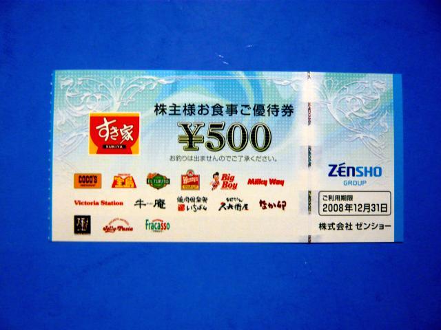 1000株以上 12000円分の食事券 (500円券6枚 4冊)