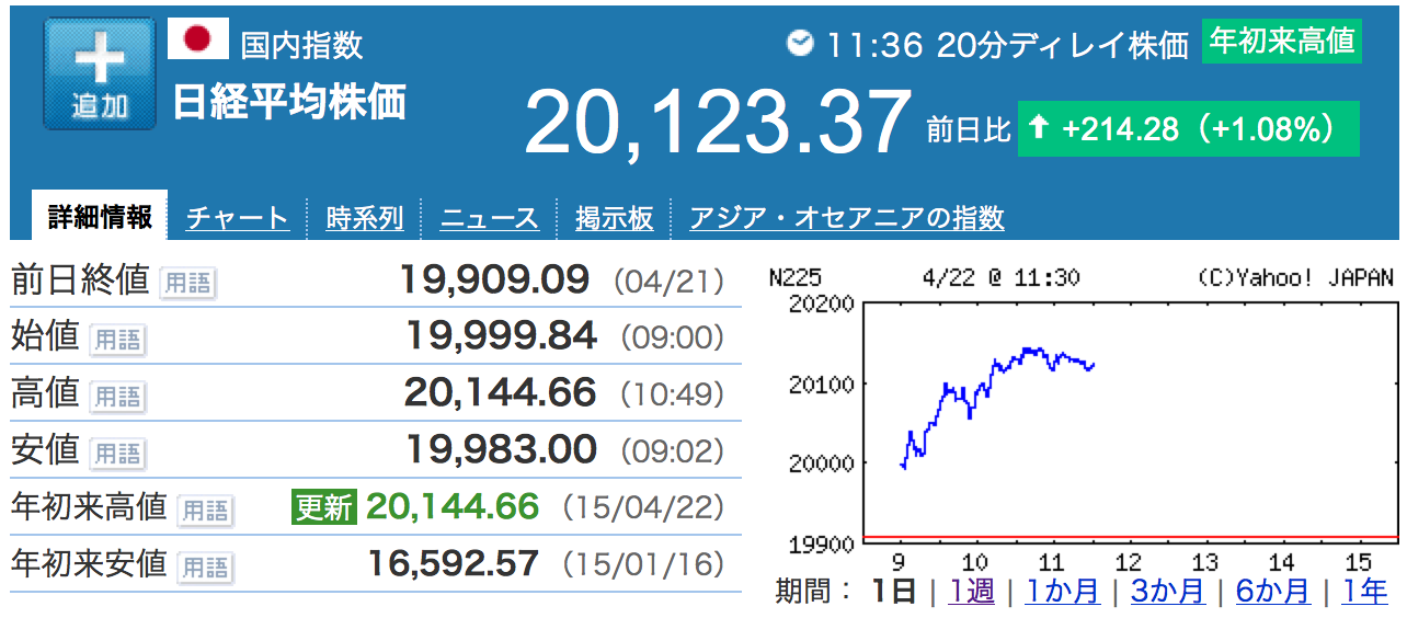 これがアベノミクスだ!というわけで、ご存知のように日経平均株価が再び20,000円台の大台を回復し15年ぶりの高値で引けています。もちろん、年初来高値を更新してますよ(*゚∀゚)っ゚∀゚)っ゚∀゚)っキタ━・キタ━!!!