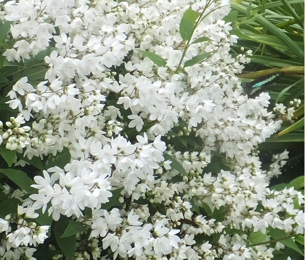 >うつぎ(卯の花)に蜜をすいにアオスジアゲハが飛びながら行ったり来たり。