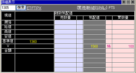 カブコムPTSで大和TOPIX-ETFがS高買気配となって