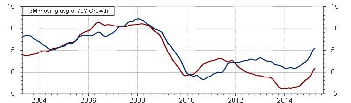 添付図はユーロ圏のマネーサプライ(M3、青)と民間貸し付け(赤)の時系列。