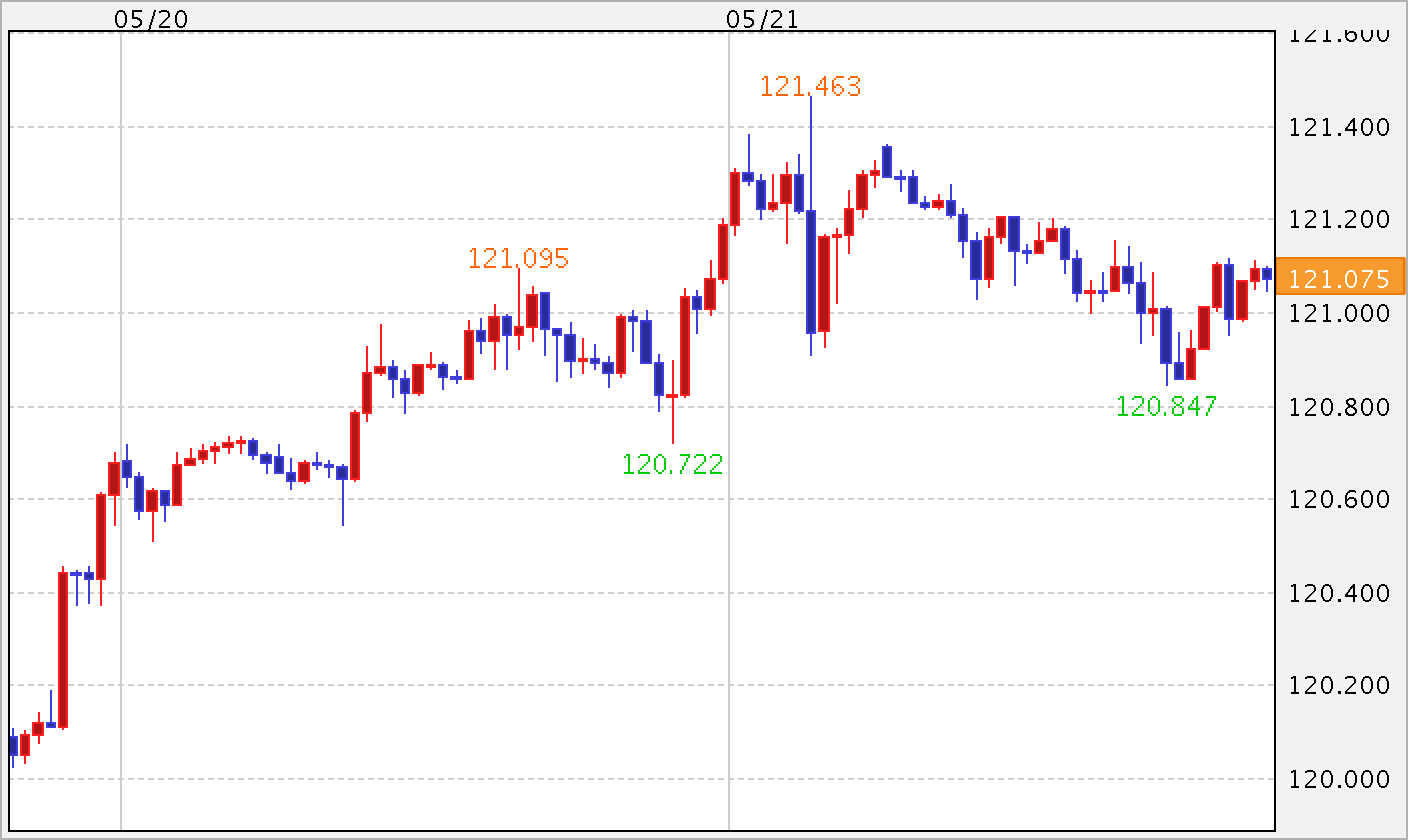 ドル・円チャート。一時は年初来高値(122.02円)が射程に入りましたが…。