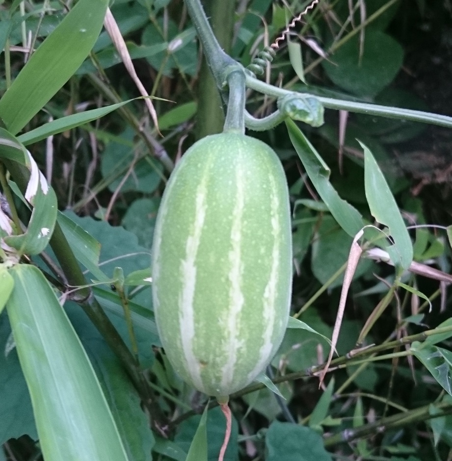 これがからすうりの実なんですね。花と連動して、不思議な感慨が湧いてきました。お茶席で飾られるオレンジ色のからすうりも、まさしく「和」の存在感があるでしょうね。