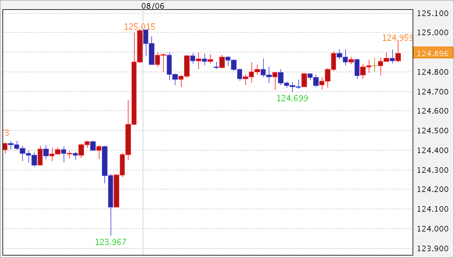 海外市場は、1ドル=124.00〜125.00円台と1円幅の上下となりました。欧州市場では、完全なモミ合いとなっており、10銭程度の値幅での上下が続きました。NY市場では、(米)7月ADP雇用統計が予想を下回ったことで安値をつけましたが、底堅く推移。そして、(米)7月ISM非製造業景況指数が10年ぶりという非常に強い水準となったことで125円台にタッチしています。