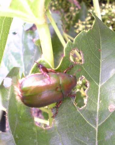 こがねむし、アオドウガネです。名前からしてきらきら光って高価な感じですがどんな葉っぱでも食べるので油断するとはがなくなってしまいます。以前は高知県など南方にいましたが40年代に愛知県に上陸し今では此れが一番ふつうの黄金虫です。土を掘り起こすと幼虫がいっぱい出てきます。