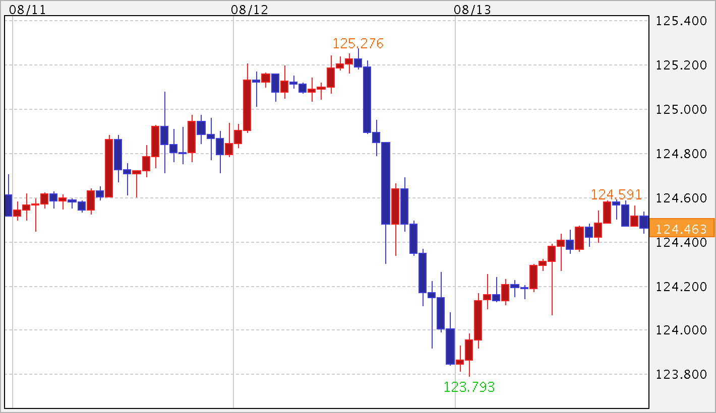 海外市場は、1ドル=123.70〜124.80円台で1円幅での急落となりました。欧州市場では、東京市場の流れをそのままに、中国のドル売り介入が意識されて軟調な値動きが続きました。NY市場に入ると、中国への依存度の高い企業の株が売られたこともあり、NYダウが大幅下落となって釣られる形でドル・円も下押され安値をつけました。